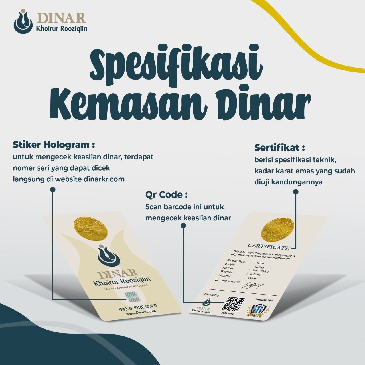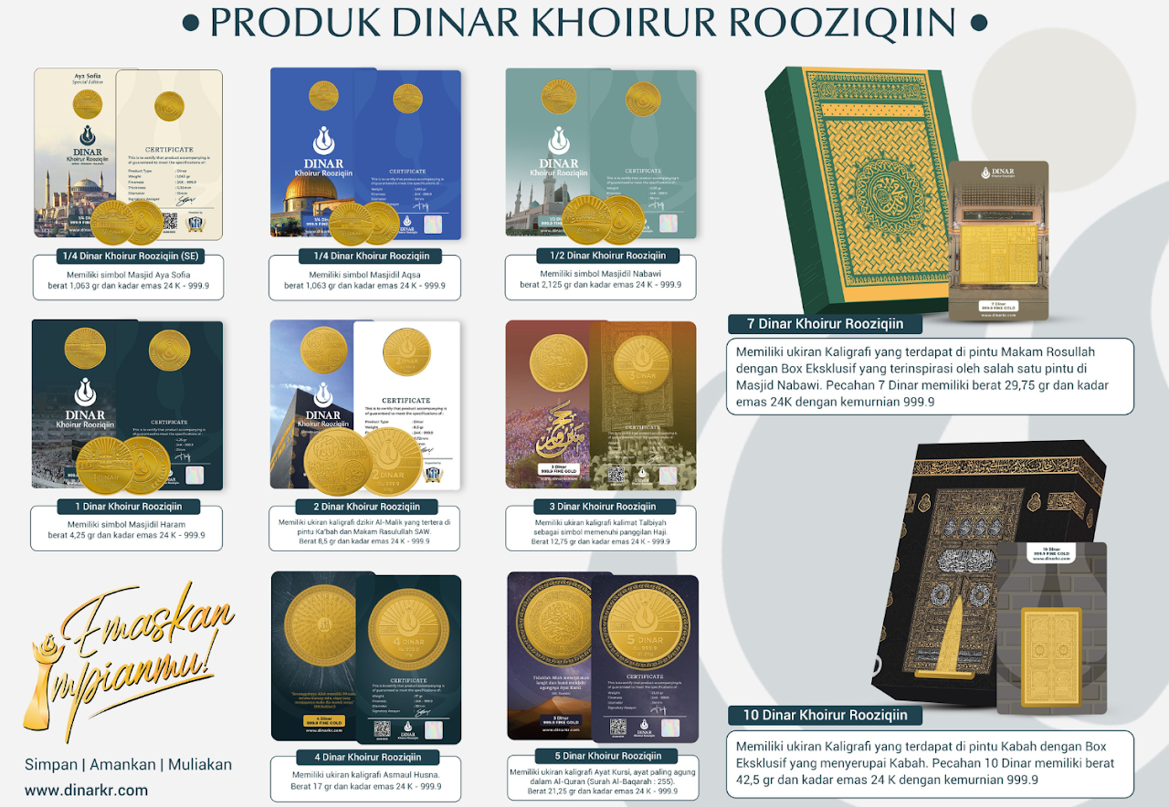 Dinar Khoirur Rooziqiin adalah Emas 24 Karat dengan Au 999,9 yang berukir hiasan, doa dan Ornamen Islami. Digunakan sebagai Barang Koleksi, Alat Simpan, Hadiah, atau Mahar.